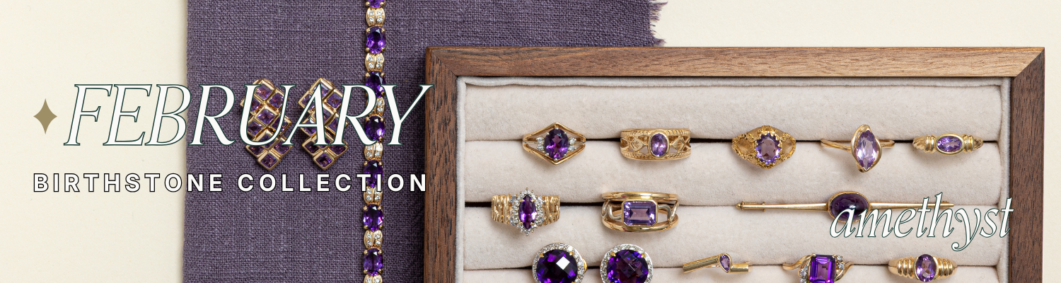 Celebrated as the birthstone for February, amethyst is a cherished stone for those born under Pisces and the traditional gemstone for a sixth anniversary. Discover our complete February Birthstone Collection, featuring vintage, antique, and modern amethyst gemstone jewellery, pairing calming energy with luminous colour.