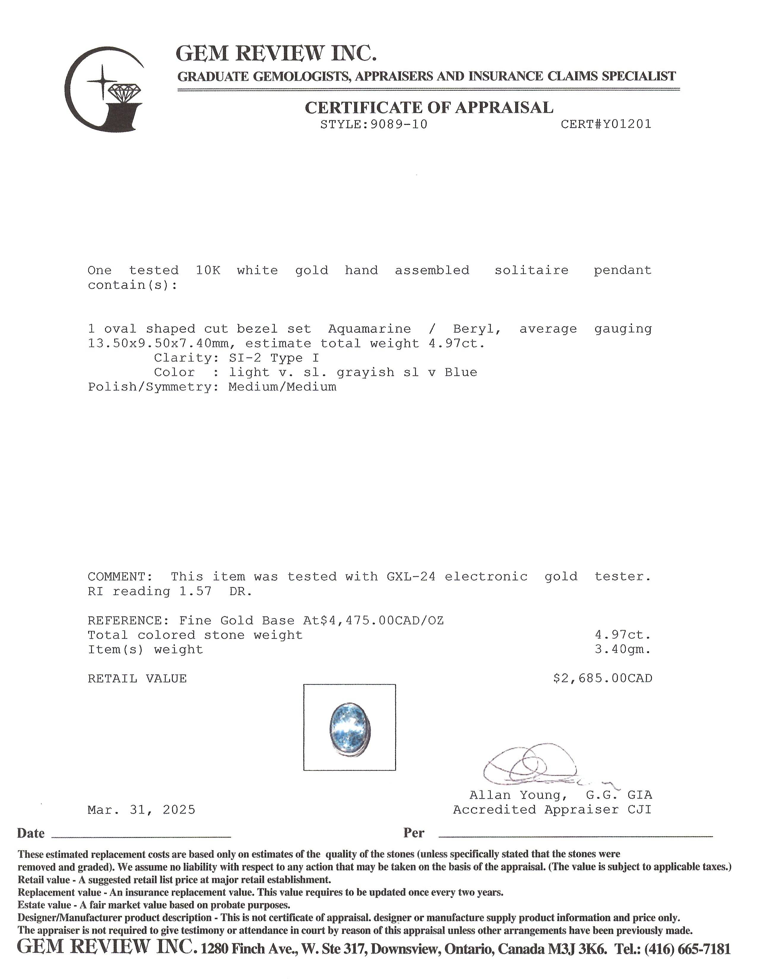 Oval Cut Bezel Set Aquamarine Pendant | 4.97ct