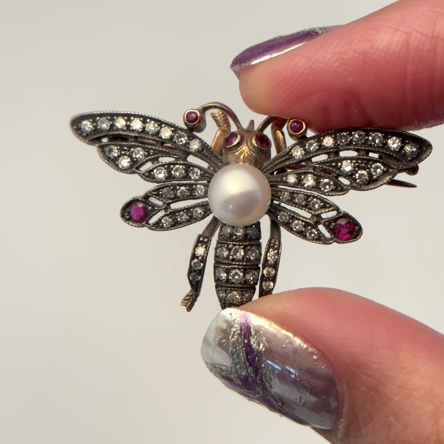 14K Rose Gold with Silver Butterfly Pearl Ruby Diamond Brooch