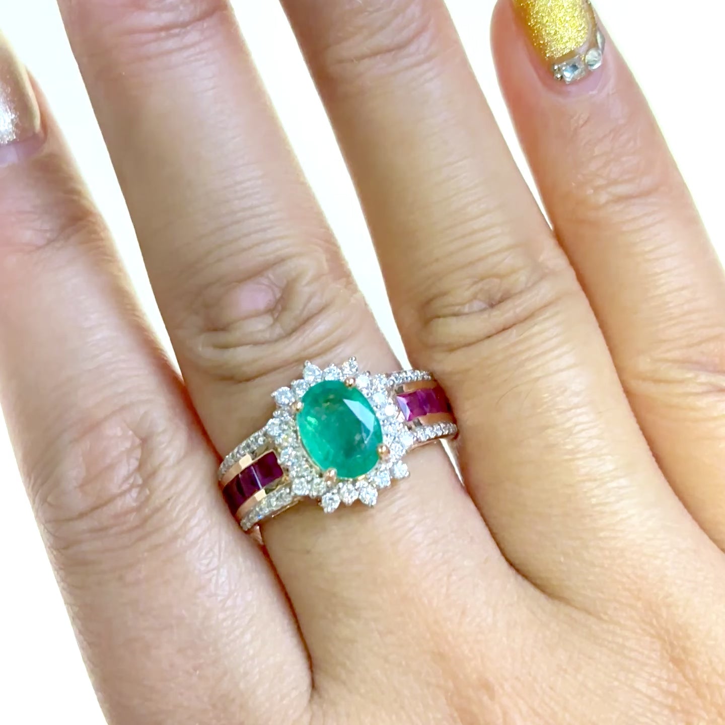 14k Rose Gold Emerald, Ruby & Diamond Ring