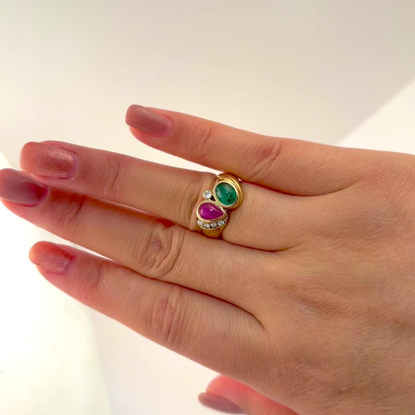 14k Emerald, Ruby Cabochon with Diamond Ring| 0.95ct, 1.05ct, 0.15ctw | SZ 5.75