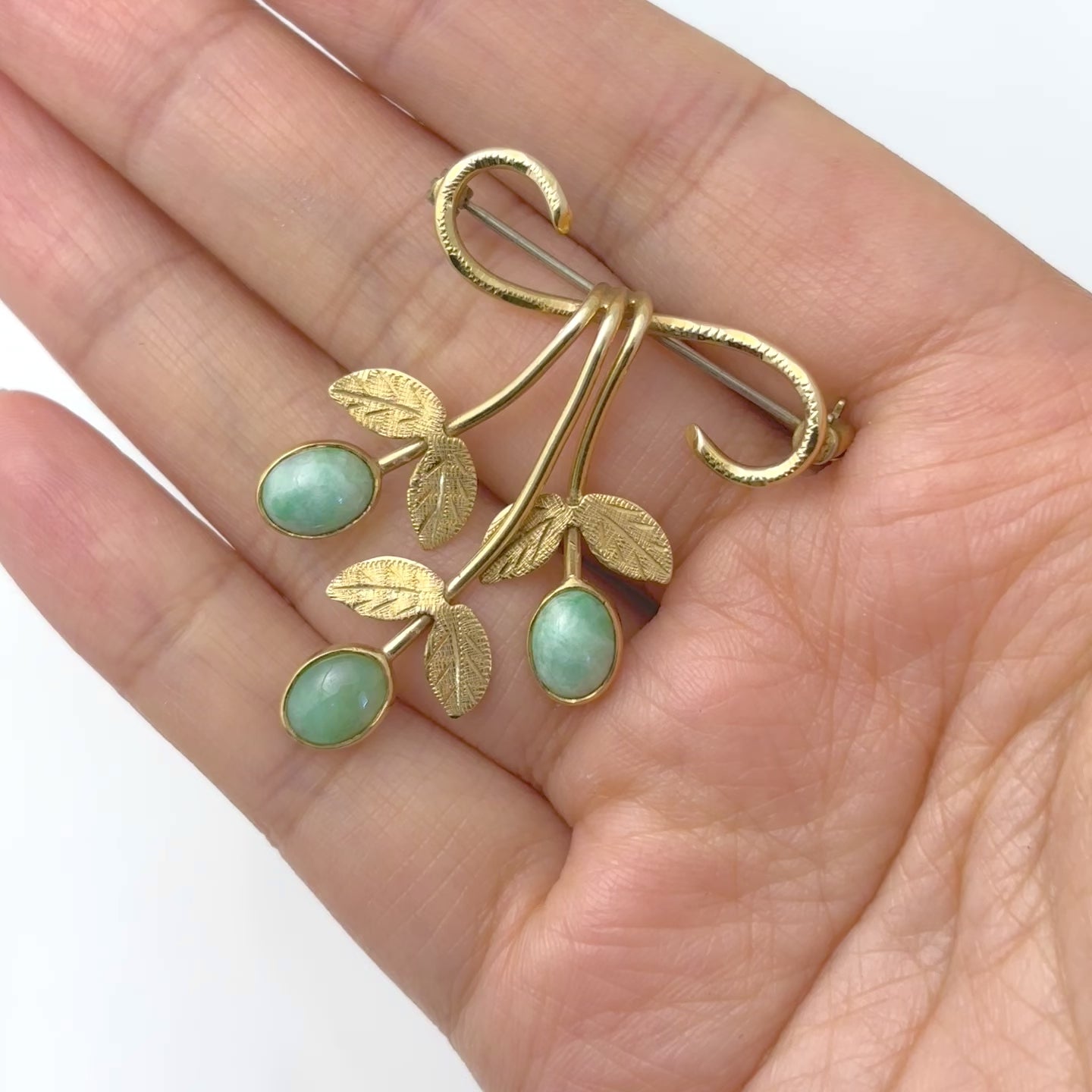 14k Yellow Gold Light Green Jadeite Floral Brooch