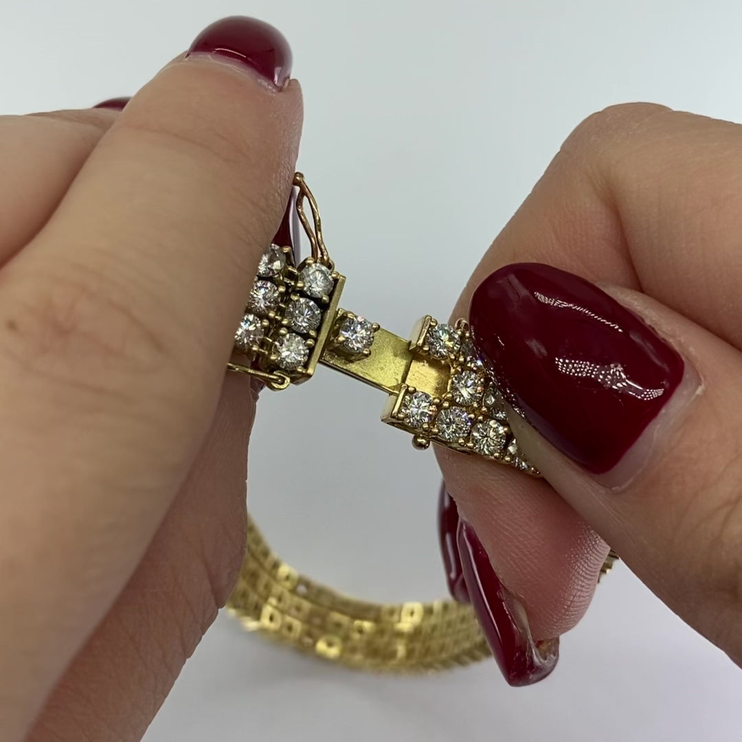 15.00 ctw | 7.5"This glamorous vintage bracelet, weighing 35.9g, is made in lush 18K yellow gold and designed in a triple-row tennis bracelet style. It is set with a decadent 15.00ct of natural, round brilliant-cut diamonds. It is 7.5" in length.