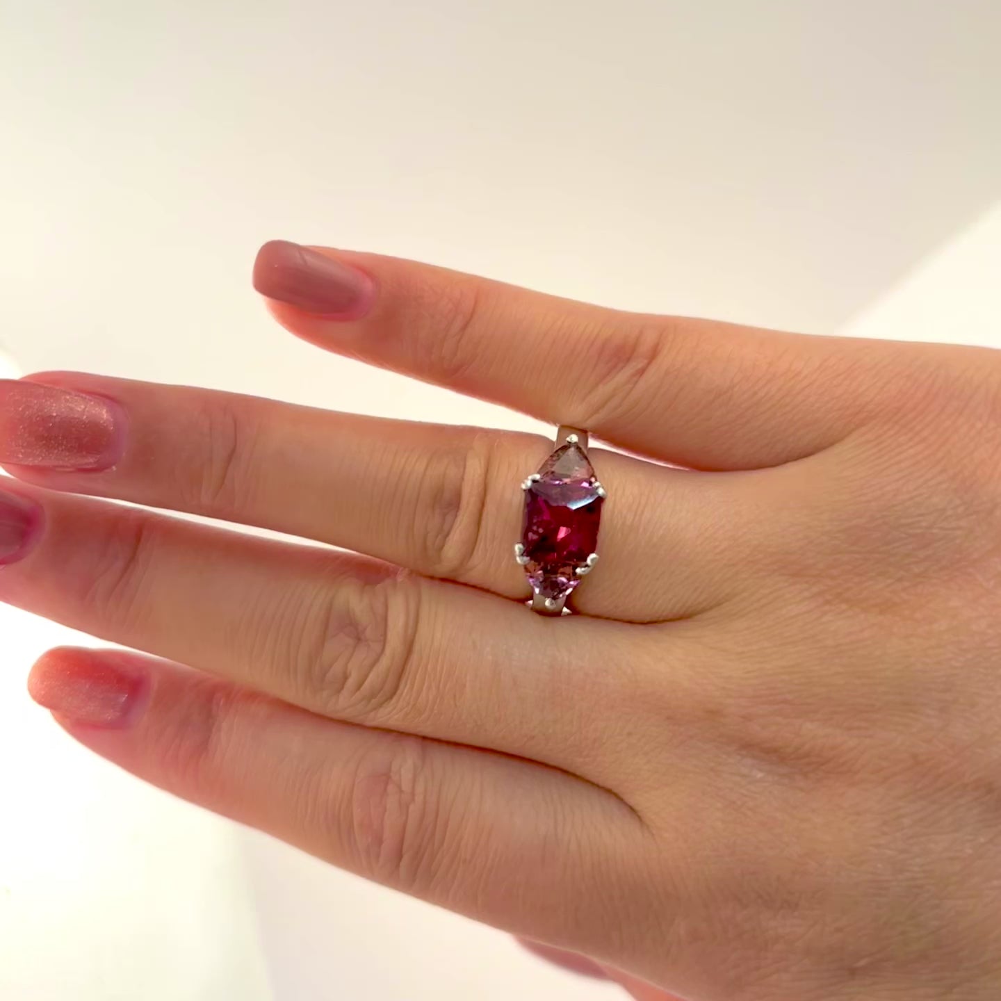 | Gemstone | Princess Cut Rhodolite Garnet, Triangle Cut Pink Sapphire |