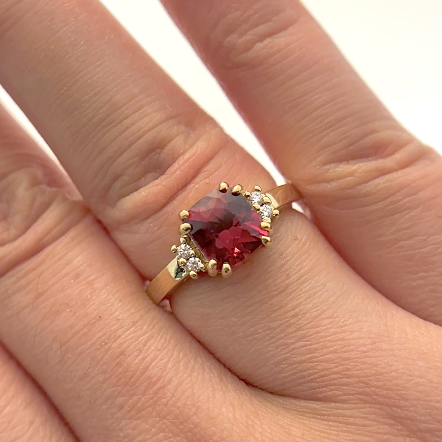 18K Cushion Cut Garnet & Diamond Accented Ring