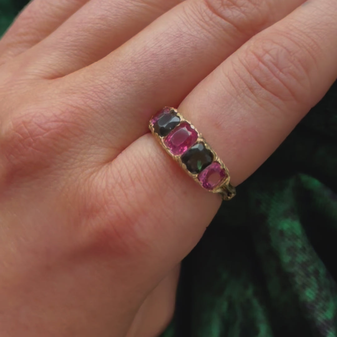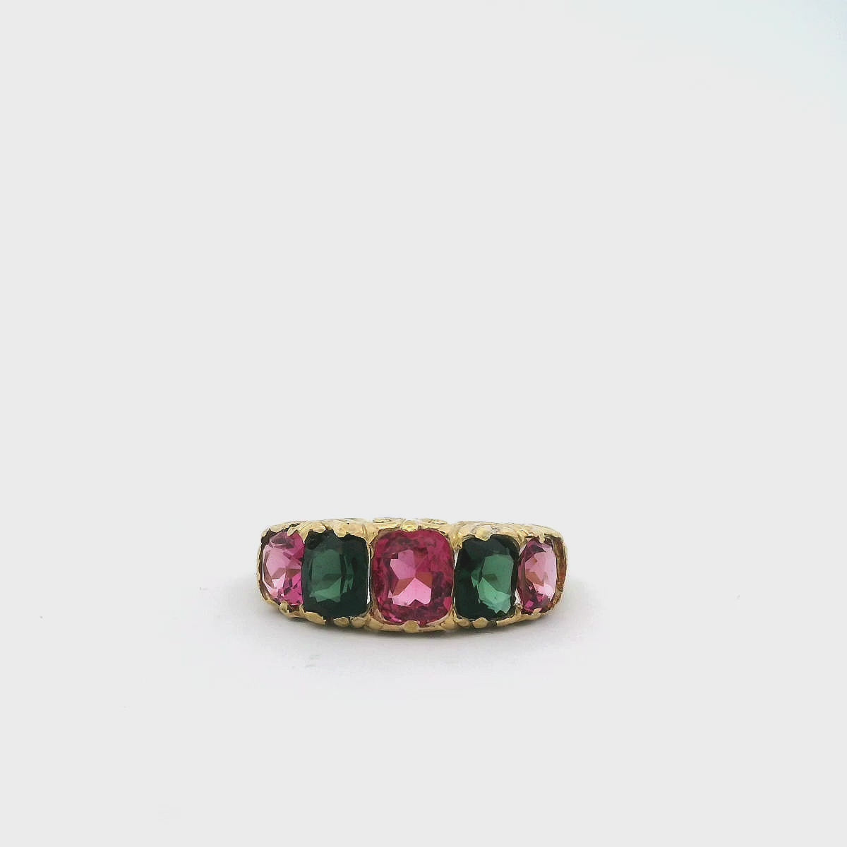 2.15ctw | SZ 7.25Lovers of rare Victorian designs should take note of this exceptional antique ring. Made in uncommon 15K gold, it is set with five natural Tourmaline stones; two of which are forest-green, and three of which are blush-pink. Beyond the surprising colour palette, this ring is made all the more impressive by the artful prongs that cradle the stones, and its beautiful scrollwork shoulders.