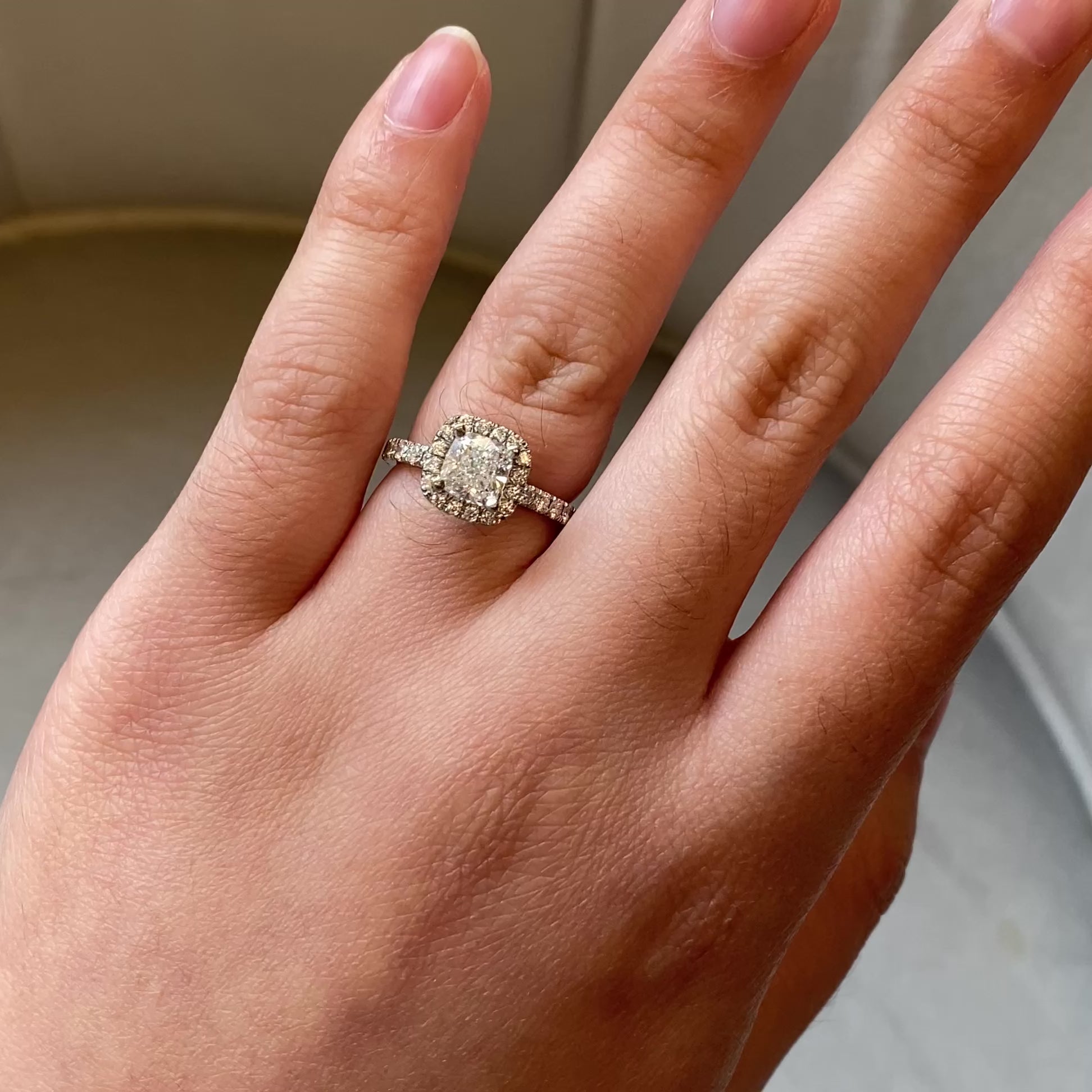 1.62ctw | SZ 5This is a classic engagement ring that offers excellent-quality natural diamonds, not the least of which is its near-perfect, full-carat, cushion-cut center stone. It is surrounded by a halo of equal-quality accent diamonds around the setting and down the shoulders, all set into bright 18K white gold.