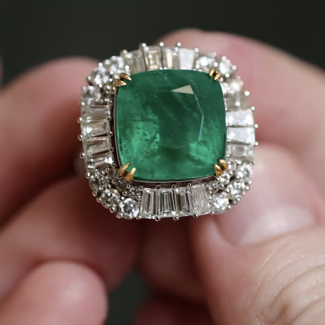 Cushion Cut Minor Oil Emerald Baguette & Round Brilliant Cut Diamonds |