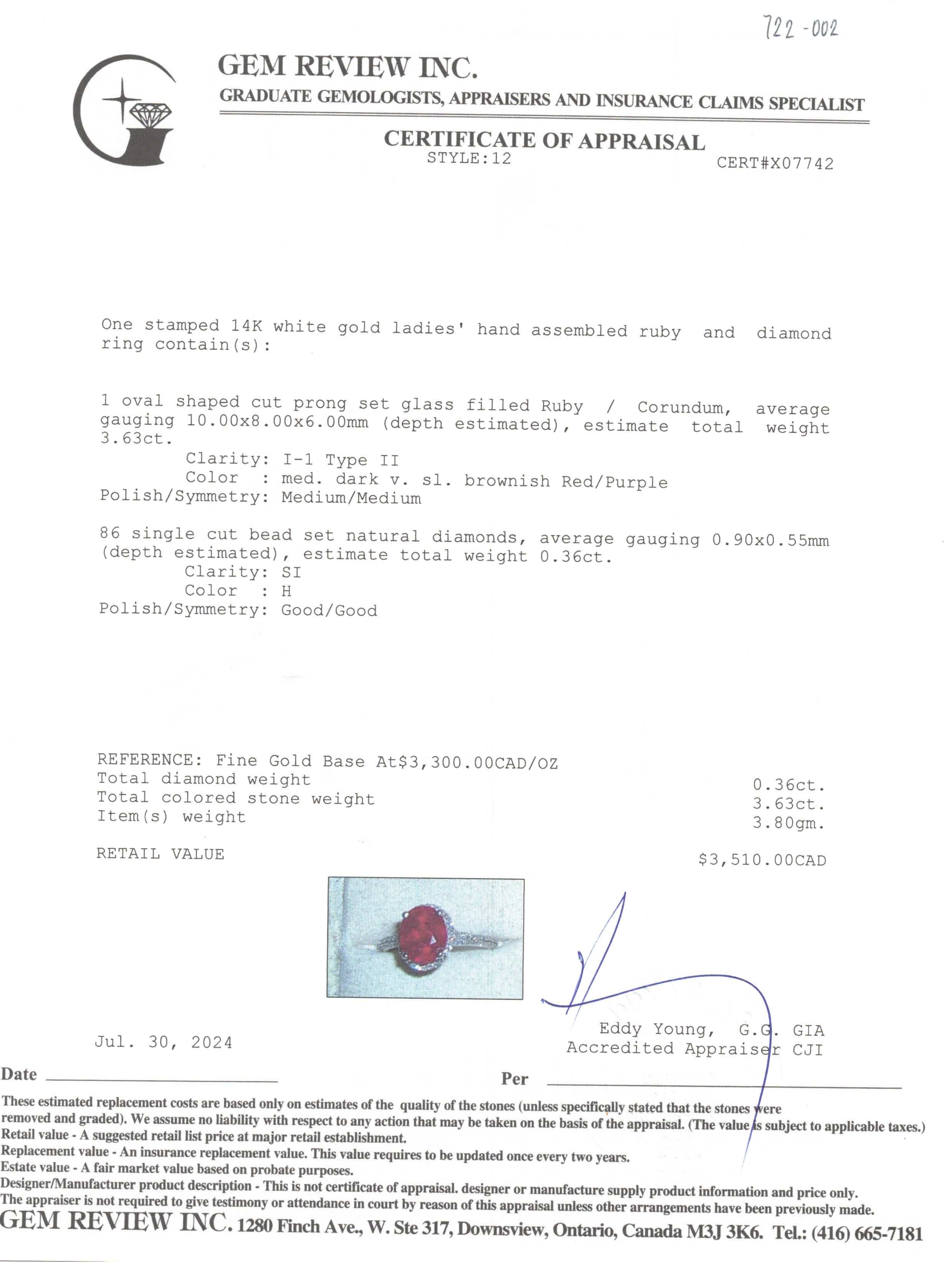| Carat | 3.63ct Glass Filled Ruby, 0.36ctw Diamonds |