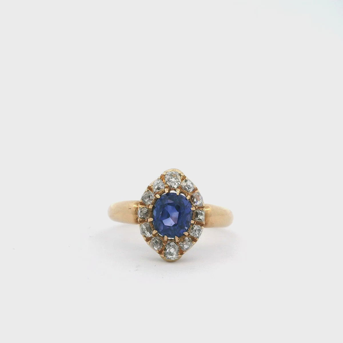 1.95ct, 0.89ctw | SZ 8.5There are few eras in history with a legacy as long and influential as the Victorian era, and this ring is an excellent example of that moment. This piece, with all of its hand-fashioned charm, is made in 18K yellow gold and designed in the “navette” style. (“Navette” means “little boat” in French, and was a popular shape through most of the Victorian era). It is centrally-set with a richly-hued, 1.95 carat cushion-cut, colour-change natural sapphire. It is encircled with a gleaming halo of diamonds in two styles of old cuts: old-mine cut and table-cut. It is hand-engraved “1878” inside the band.