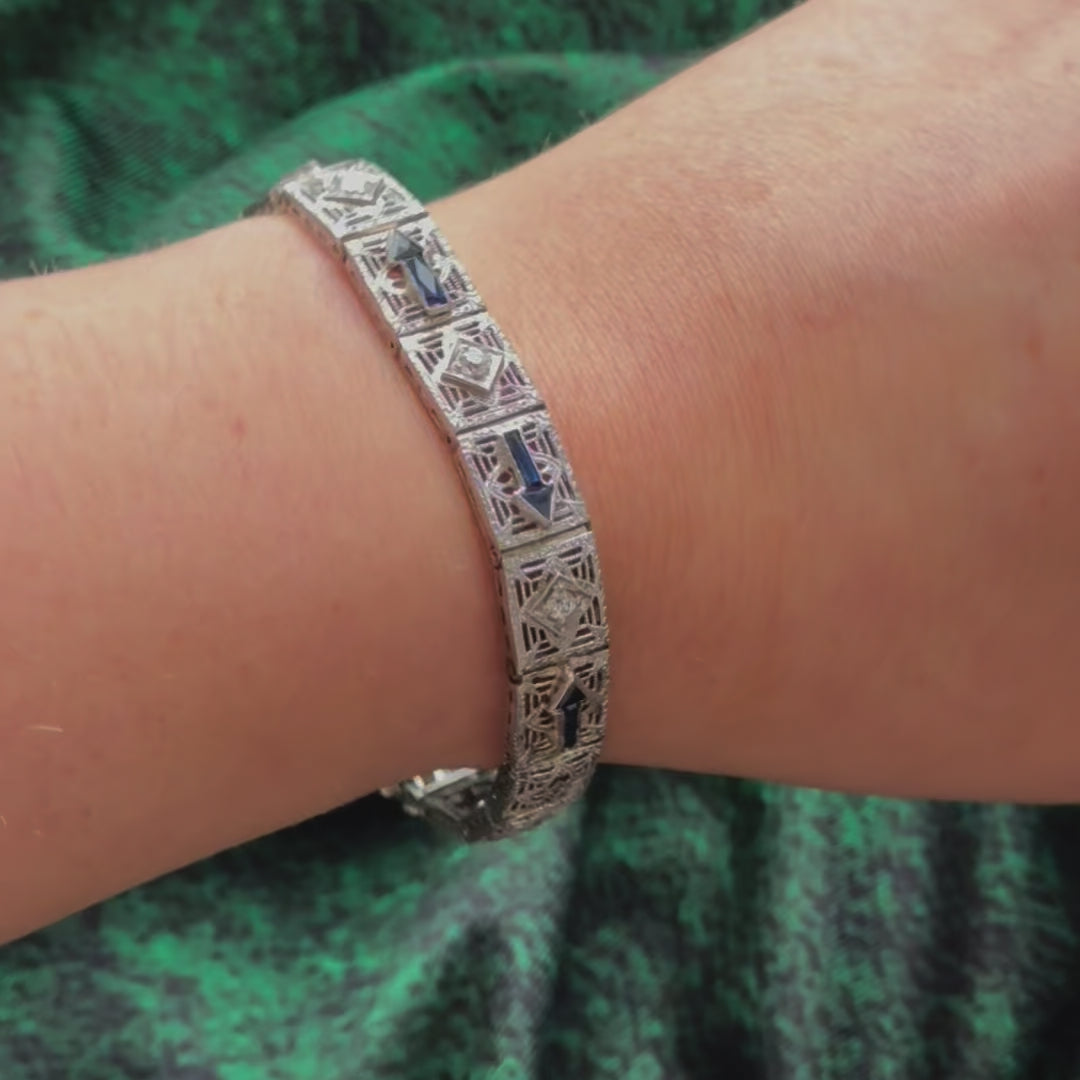 1.20ctw, 0.50ctw | 7"This style of bracelet is as iconically Art Deco as The Great Gatsby, or the Chrysler Building. Made in 14K white gold, it offers a highly-detailed filigree design that is set throughout with synthetic sapphires (a telltale clue that a piece is Art Deco) and old European cut natural diamonds. The rich sapphires, of various cuts, are delightfully arranged to form little arrows that move across the body of the bracelet. They are punctuated by a half-carat of excellent-quality old-cut diamonds.