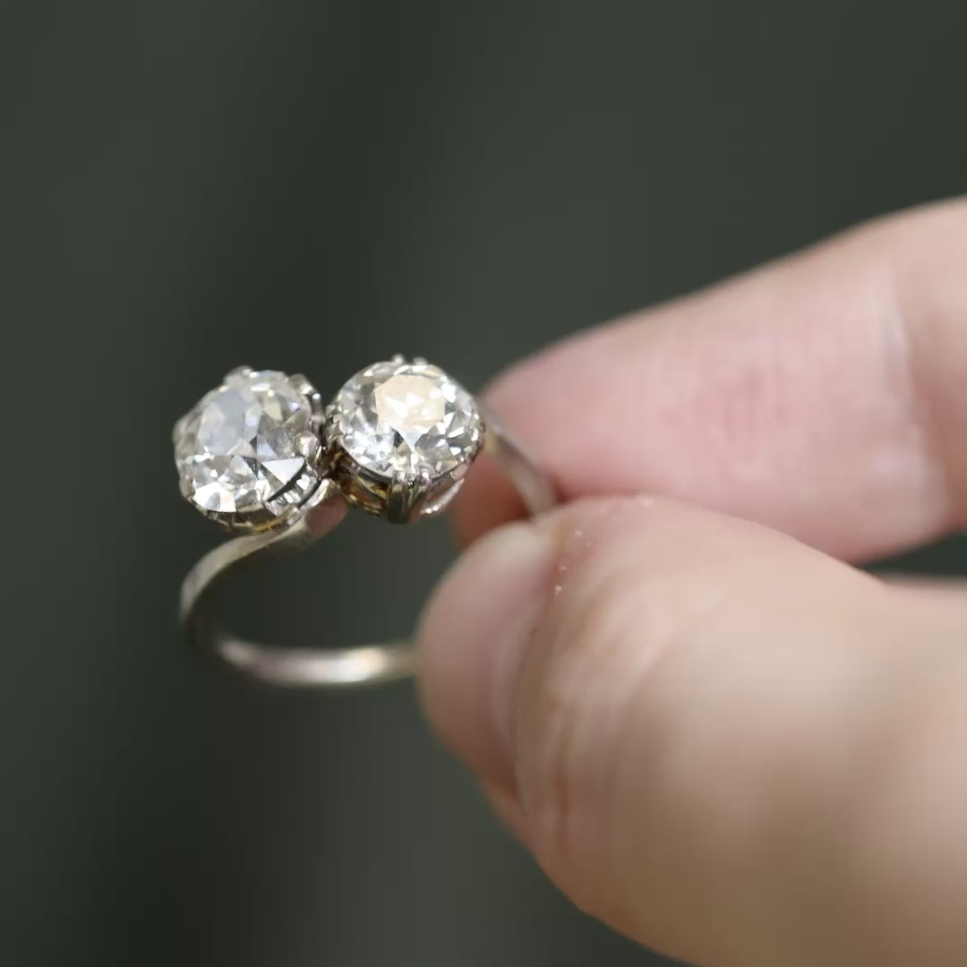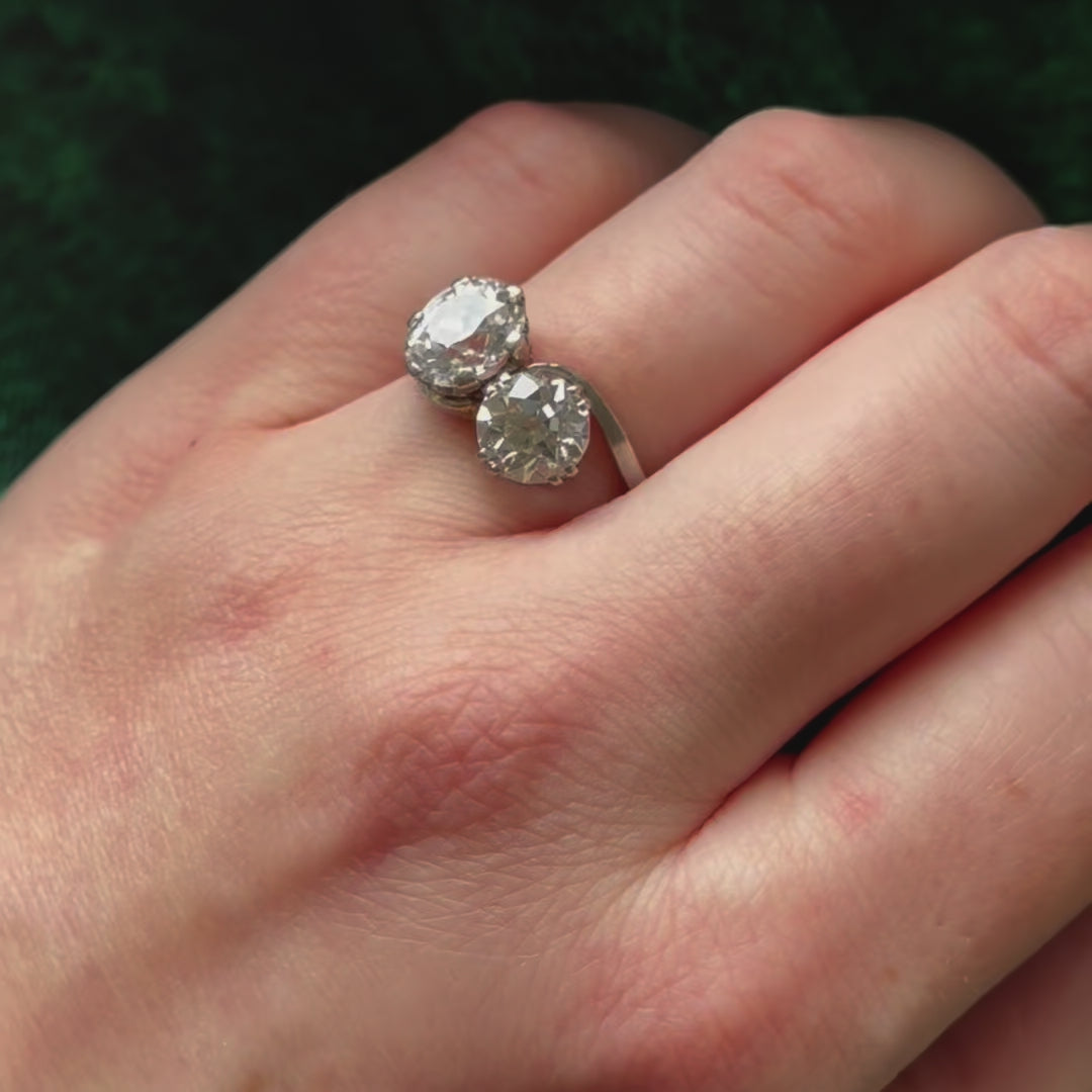 3.20ctw | SZ 6.75A "Toi et Moi" ring has been a symbol of sophistication, luxury, and romance-- ever since Napoleon proposed to Josephine de Beauharnais with one in 1796! This stunning example boasts two substantial natural diamonds totalling 3.20 carat between both, cut in the desireable Old European antique style, and set into solid Platinum. A perfect, poignantly-sweet engagement ring for the lover of history and antique aesthetics (and big, gorgeous diamonds!)