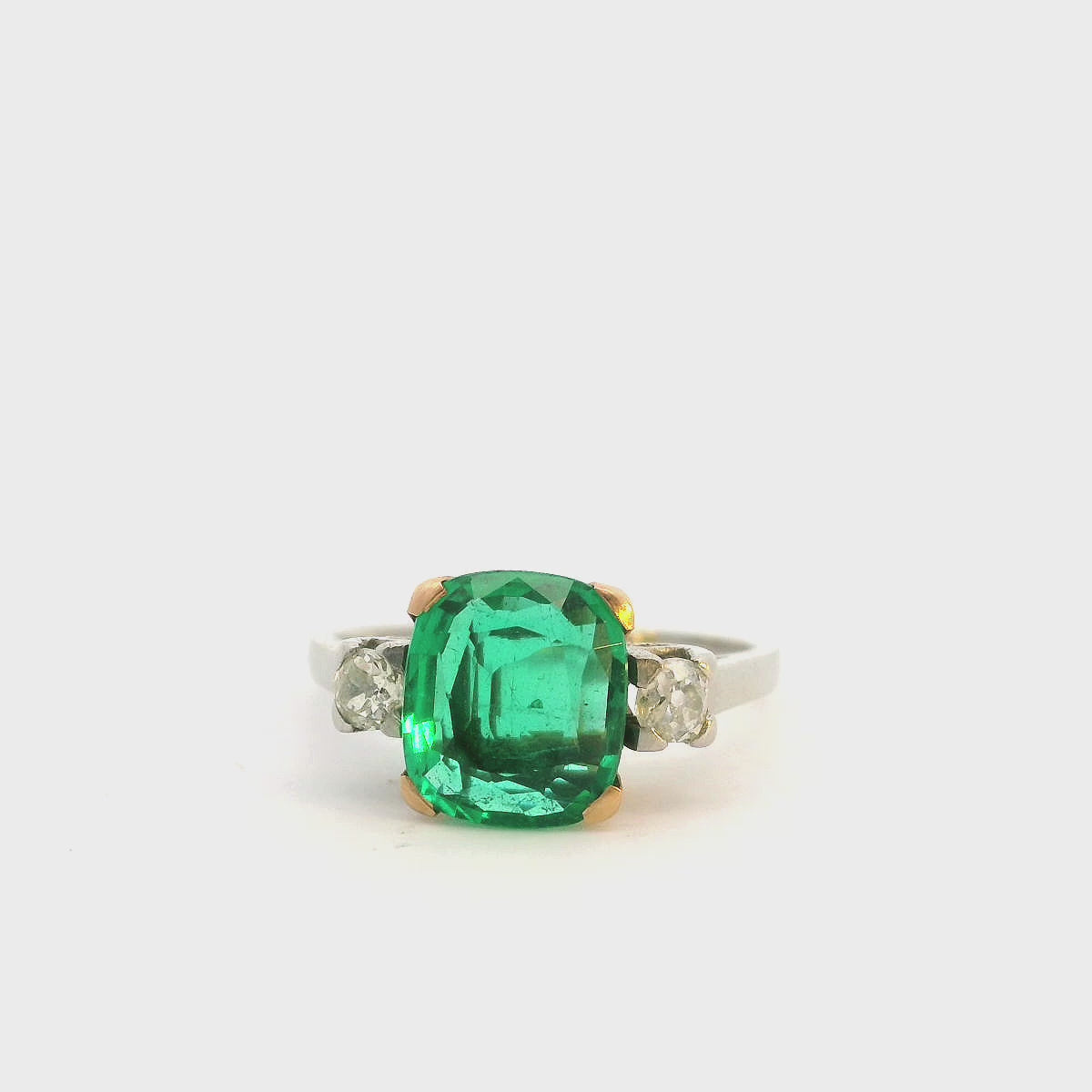 2.15ct, 0.24ctw | SZ 7.5The emerald you see here is the sort of stone that would have inspired the famous poets who wrote odes to emeralds. Offering a generous weight of 2.15 carat, this fine natural emerald was mined in Afghanistan, making it extra-special! This region usually only yields much smaller stones, which makes this a rare piece. The lush, verdant emerald is flanked by two natural old-cut diamonds, set into 18K yellow gold, all atop a band of solid platinum. A powerful and poetic piece for the discerning collector of vintage jewellery.