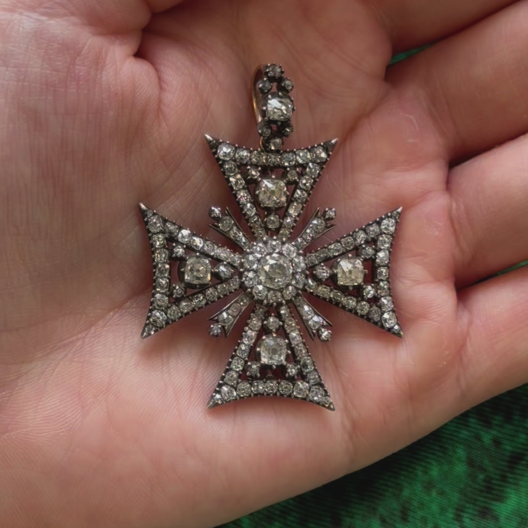 This is a one of a kind Georgian Era diamond Huguenot convertible pendant/brooch. To our best estimation this piece would have been crafted prior to the early 1830's.