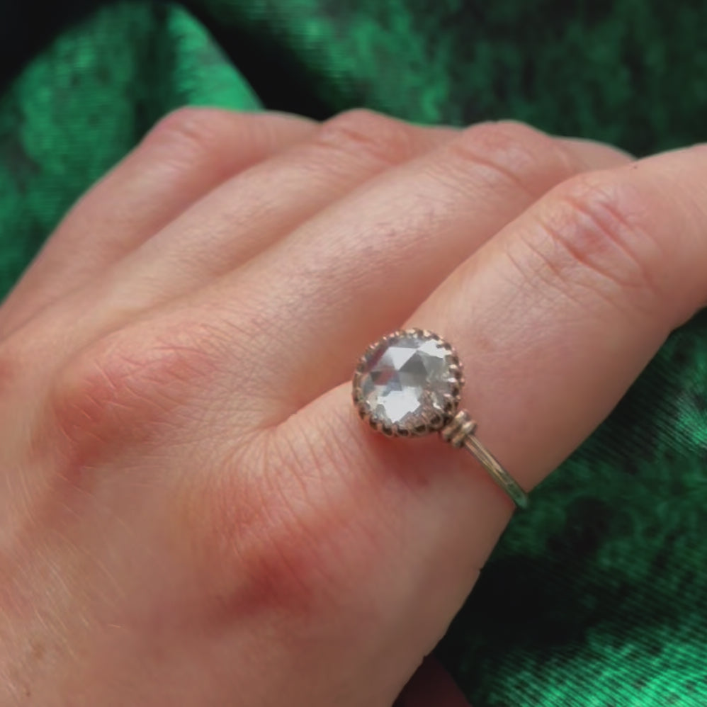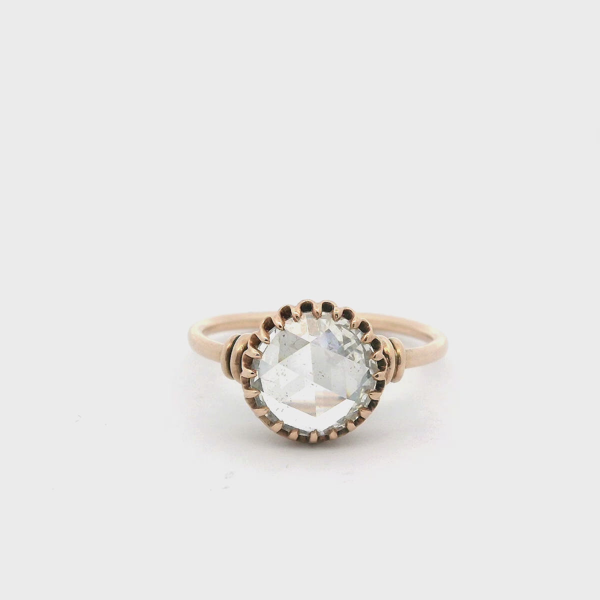 2.14ct SI1 J Good | SZ 8.25Antique rose-cut diamonds of this size and scale are becoming harder to find, making this ring a significant future heirloom. Many small prongs clutch the natural 2.14 carat stone, so that it sits perched in a crown, with only the simplest details at the shoulders for embellishment. Made in rare 12K rosy gold, the design of the ring allows for the elegant and impressive stone to sparkle endlessly across the finger.